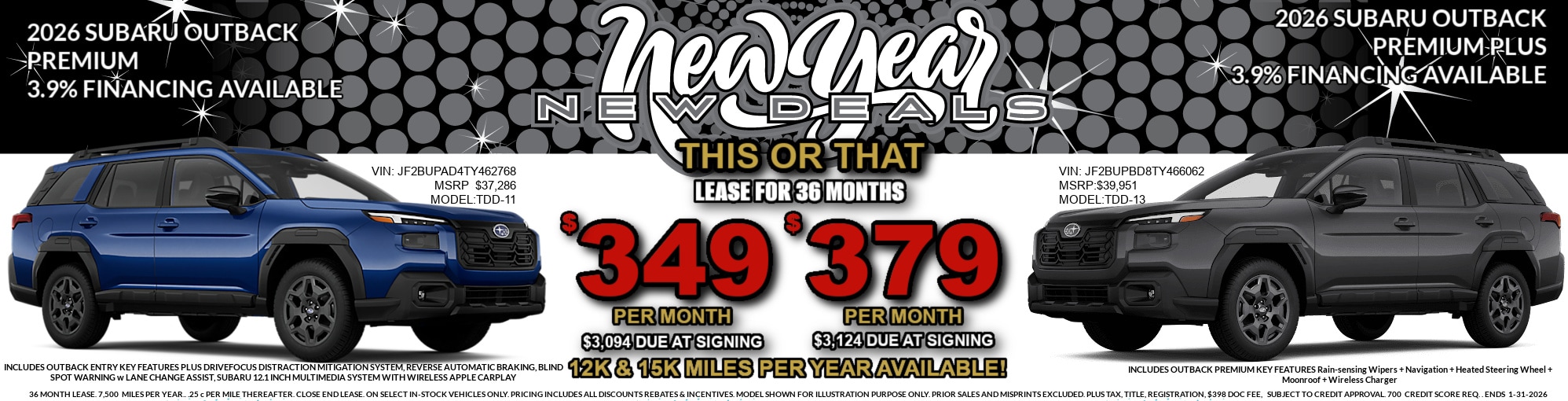 Offers subject to change. Closed end leease, 10k miles per year, $.15 thereafter, $250 documentation fee, tax, and plates are extra. Subject to credit approval. In stock vehicles only. All available coupons, rebates & incentives included. All sale prices exclude available factory options. Some restrictions apply. 700 credit score required. Subaru, Impreza, Ascent Outback, Legacy and Crosstreck are registered trademarks. Acquisition fee included in lease. *On select models. Sale ends 9/30/2022